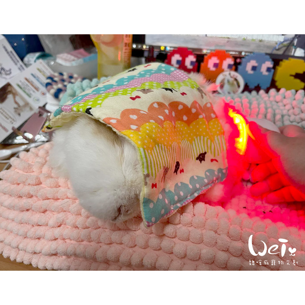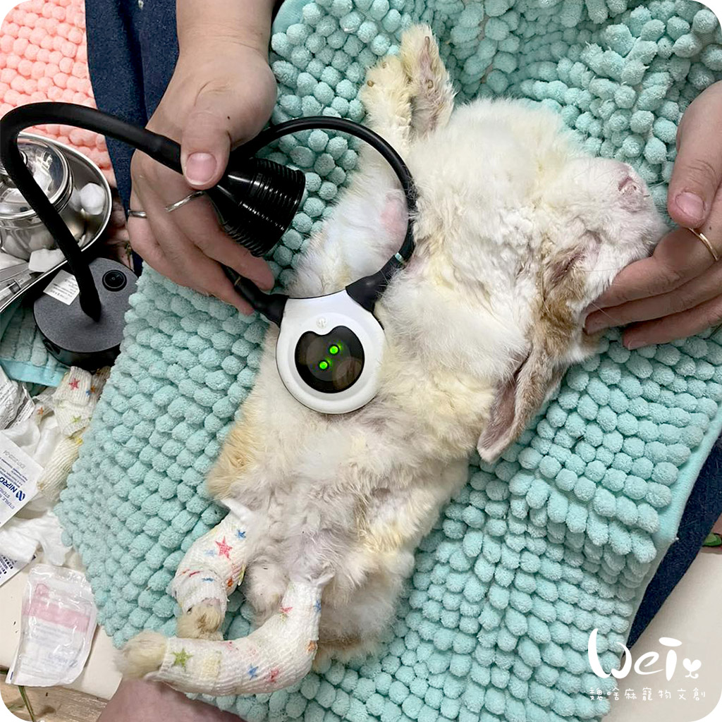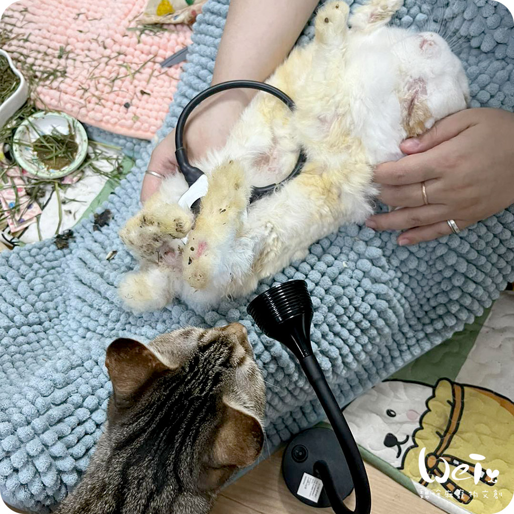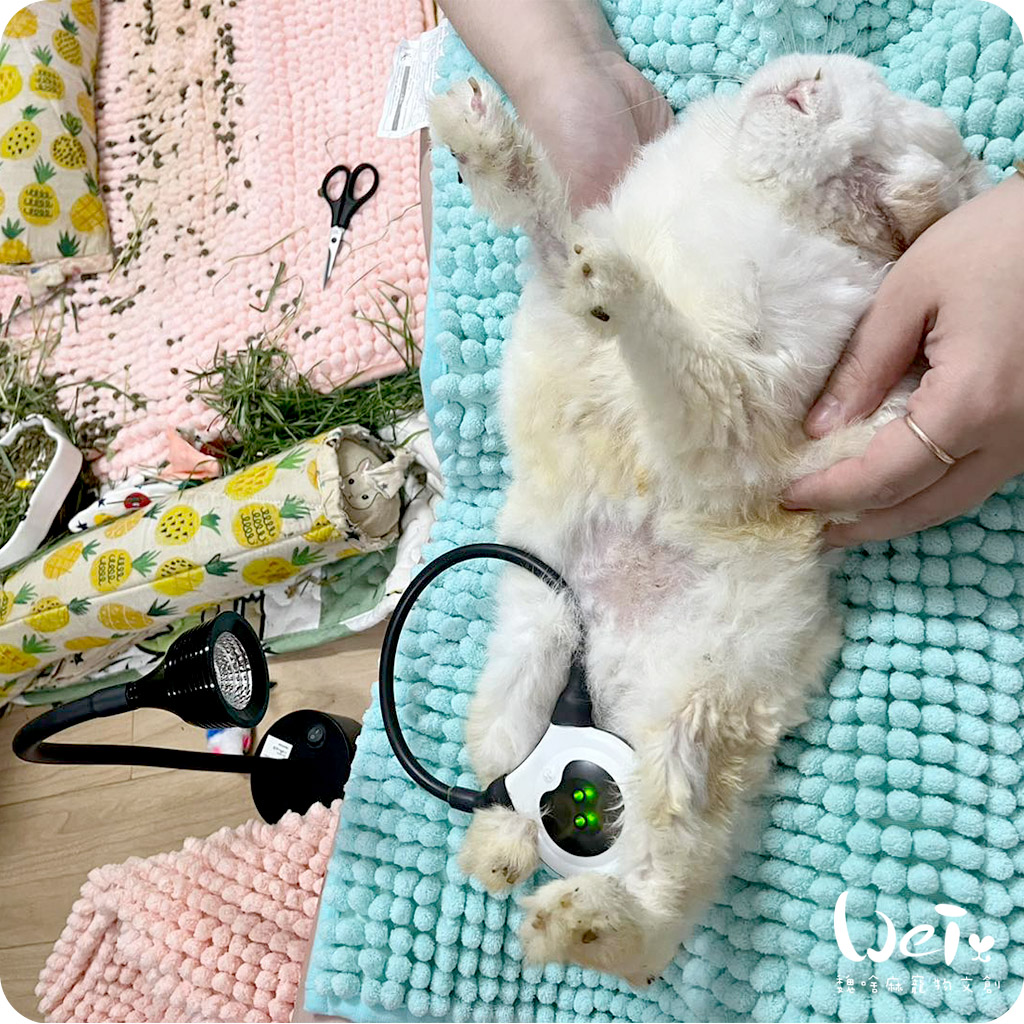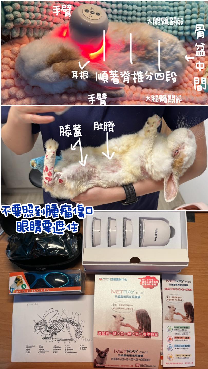 機器終於到貨,感謝潘醫師教我們如何使用以及怎麼照糖果的穴位,醫師有印一張兔兔圖,跟我們說要照糖果身上哪些位置