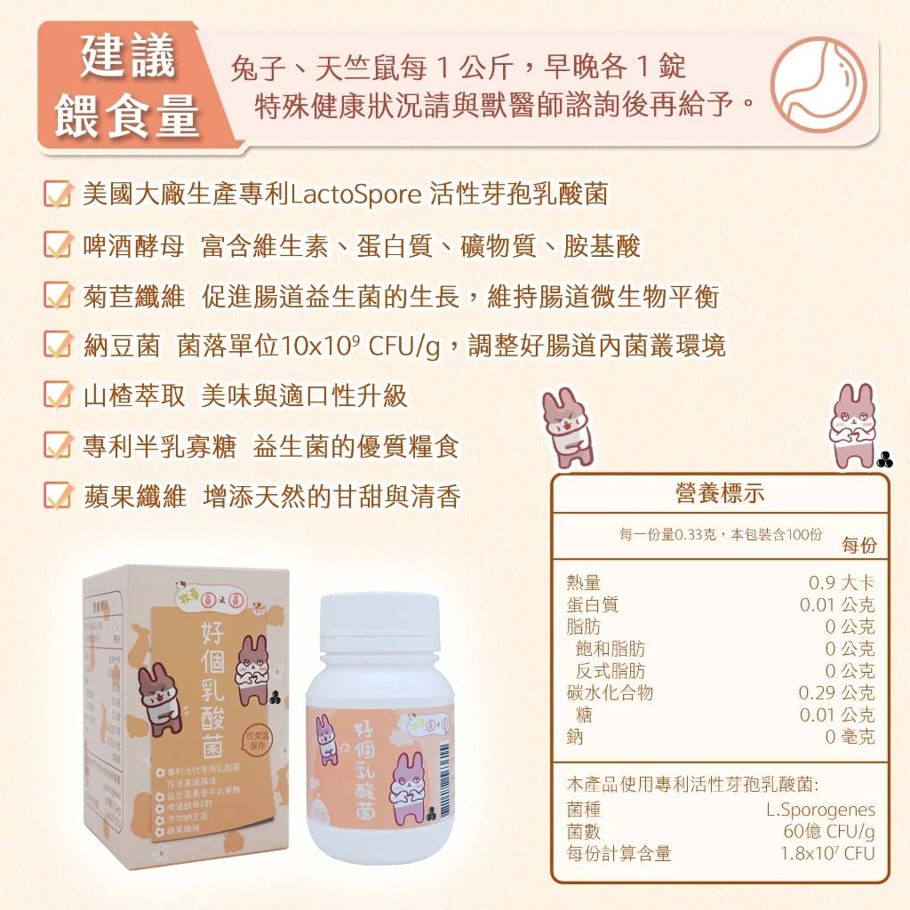 用量:天竺鼠─1錠/日、兔子─每1公斤1錠/日