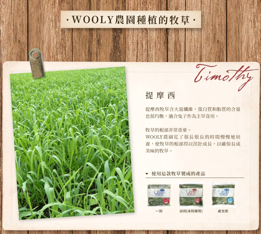 我們也推薦這款牧草給愛挑食的兔寵及牙齒不好的兔寵。3.現在WOOLY農園生產哪幾種牧草呢?WOOLY現在生產的牧草有:提摩西、意大利黑麥草、麦草、燕麥草4種