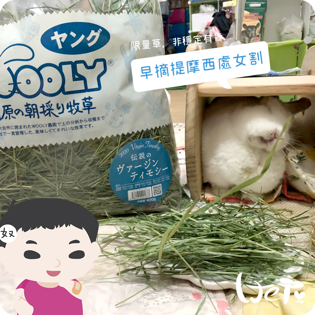關於這點希望飼主們能夠給予諒解另外在此WOOLY想麻煩各位飼主,在餵食前稍微檢查後才給您的愛兔食用6.要怎樣保存牧草呢?有自封袋口的商品要注意不要讓袋中有大量空気進入沒有自封袋口的商品,開封後請放入密封容器裡商品不要放置在陽光直射的地方,盡量選擇濕度較低的地方存放7.為什麼每次換新年度牧草時,兔子對牧草的喜好程度會有少許變化呢?根據每年氣候等的變化,收割的牧草味道等也都會隨之發生少許的變化兔子對味道很敏感,可能察覺到了這些細微的變化,所以才會出現以上狀況請各位飼主放心使用。WOOLY的員工們對牧草有嚴格的管理制度